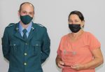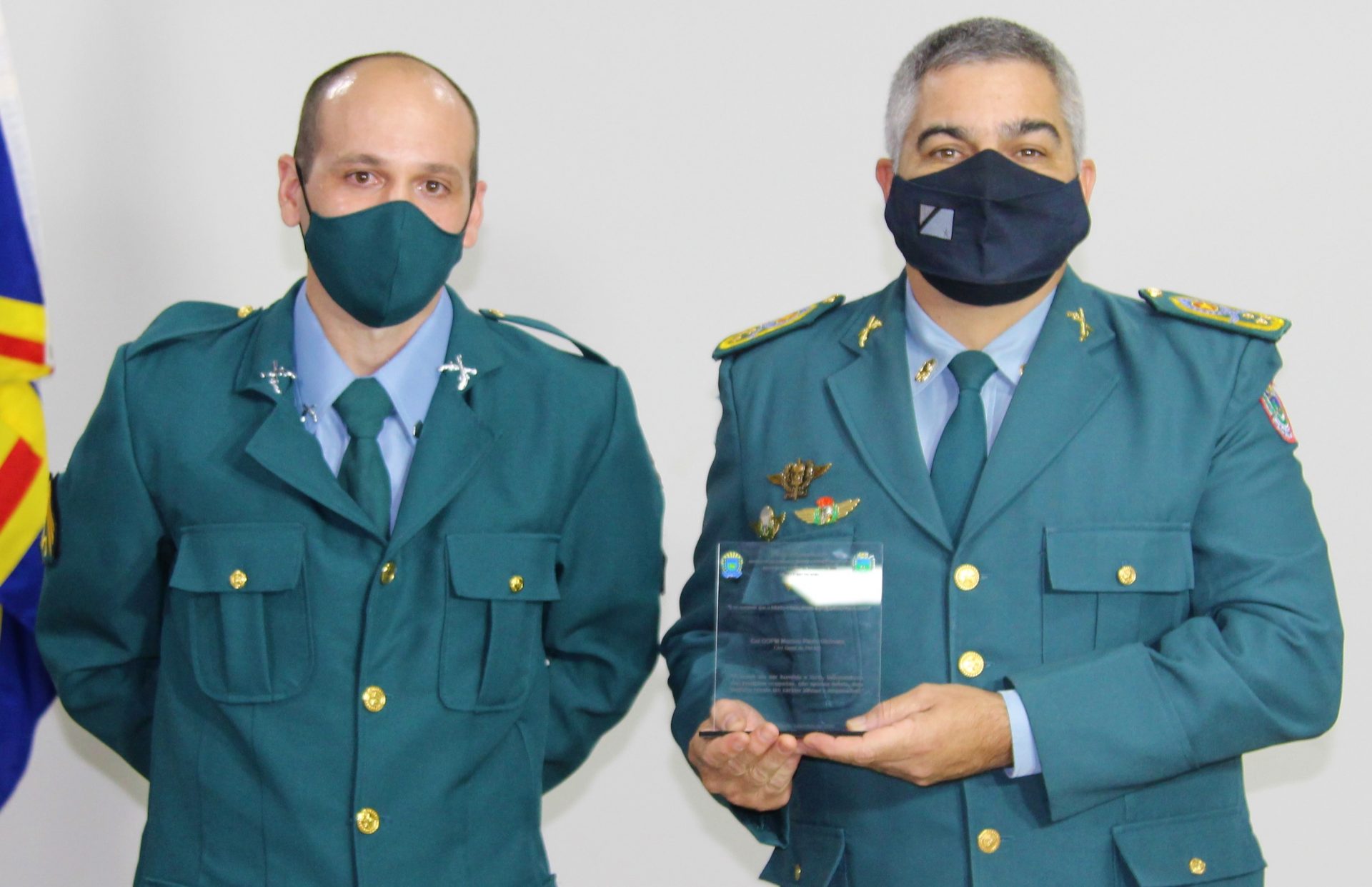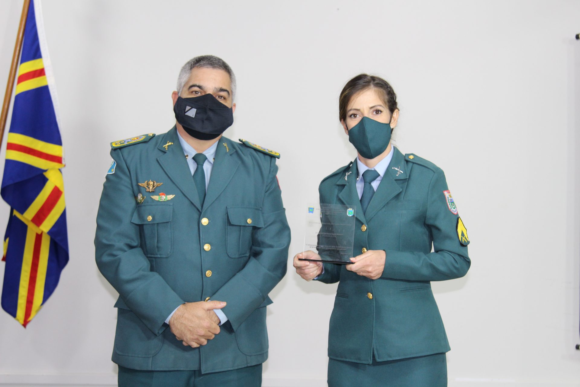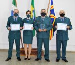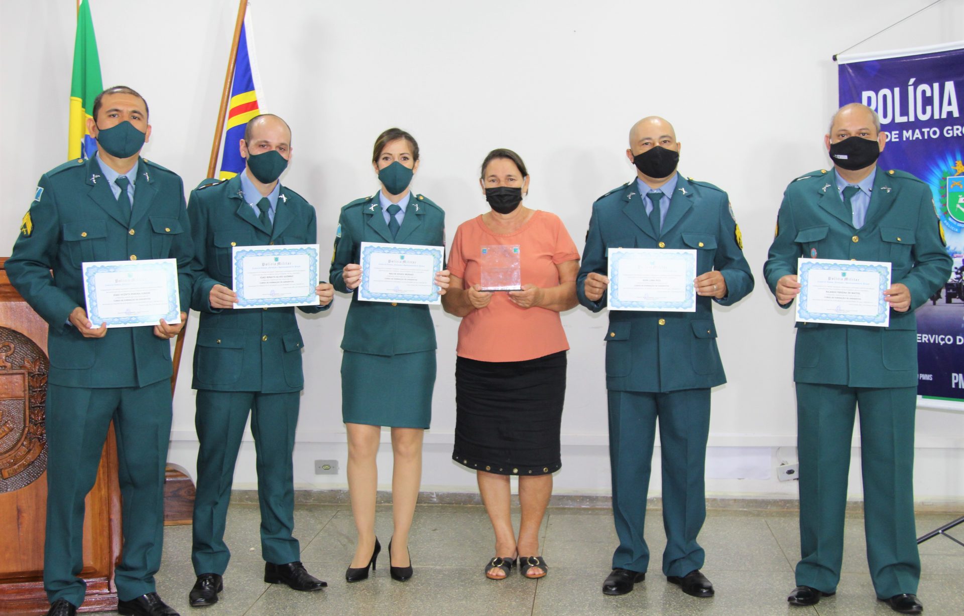 A Senhora Maria Inês Rossi, genitora do 3º SGT PM Eduardo Rossi Góes (in memorian), que foi homenageado pela turma CFS 2020, a Cabo PM Rosemeire Dias de Souza Silva, paraninfa da turma, o Capitão PM Paulo Cezar Padilha, patrono da turma, o Coronel PM Marcos Paulo Gimenez, Comandante-Geral da PMMS e o Secretário de Estado de Justiça e Segurança Pública, Antonio Carlos Videira, receberam placas com homenagens da turma do CFS 2020.