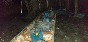 A Equipe foi rapidamente ao local e, nas proximidades de um ponto conhecido como Mirante Capivara, ouviu o motor da embarcação sendo desligado. No local, à margem do canal do Tamengo, os Policiais encontraram a embarcação abandonada com tambores com resíduos de combustível e mais 22 tambores de 50 litros também vazios, indicando ser ponto de contrabando de combustíveis da Bolívia para o Brasil.