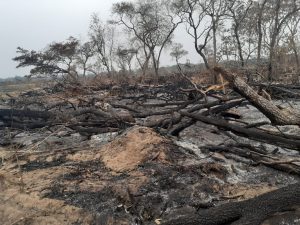 Incêndio em vegetação de desmatamento em leiras.