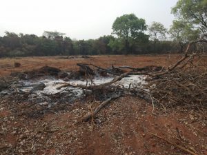 O material lenhoso das árvores derrubadas pelas máquinas pela raiz estava distribuído em leiras no local e o infrator também realizava a queima do material lenhoso também sem autorização. O proprietário da fazenda apresentou uma Autorização Ambiental Eletrônica (AAE), para limpeza de pastagem, que é retirada no portal do órgão ambiental estadual para atividade de baixo impacto, quando não envolve a derrubada de árvores e nem queima.