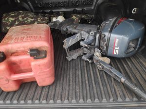 Motor de popa e tanque de combustível apreendidos.