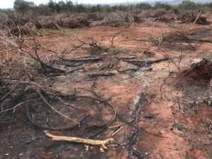 Vegetação derrubada e incendiada.