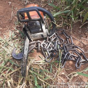 Após ouvir o som do equipamento em uma mata, a equipe caminhou em direção ao ruído e flagrou na propriedade, a utilização de motosserra pelo proprietário do imóvel. Ele informou aos Policias que realizava o corte das árvores que haviam caído com o vento, porém não possuía autorização do órgão ambiental. A motosserra foi apreendida.