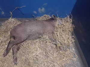 Os Policiais foram rapidamente ao local, confirmaram a informação e verificaram que o animal possuía vários ferimentos provocados por atropelamento. A anta, um macho adulto, com aproximadamente 250 kg, que aparentava estado crítico, foi resgatada, colocada na viatura e levada urgentemente para atendimento de um veterinário voluntário, no Recinto de Reabilitação de Animais silvestres (RARAS) de Bonito que tem ajudado muito a PMA nos casos com animais feridos. O bicho ficou aos cuidados do médico veterinário Marcelo Mathias.