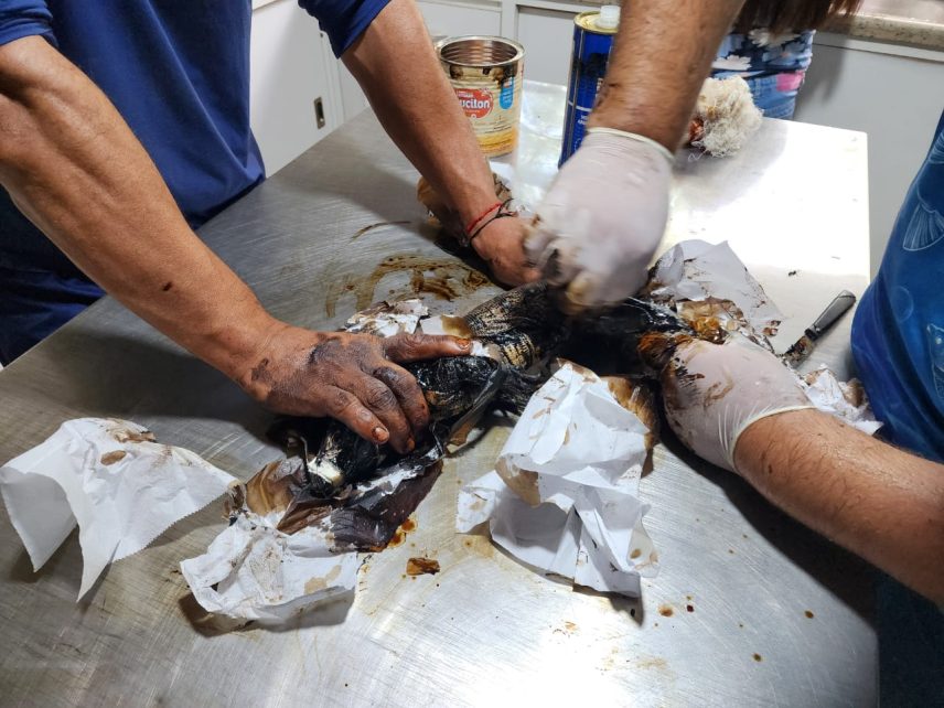 Campo Grande (MS) – Policiais Militares Ambientais de Bonito realizavam fiscalização ambiental ontem (20) à tarde, na operação Carnaval, e perceberam um animal silvestre da espécie Tupinambis merianae (Teiú) que adentrara um depósito de piche asfáltico, utilizado nas obras da rodovia MS 178 e não conseguia sair. Devido ao tempo em que o bicho estava preso ao material sua saúde já estava afetada e ele morreria no local.