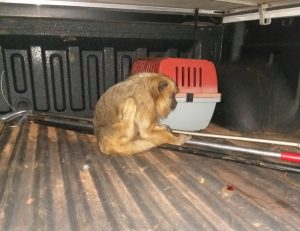 Campo Grande (MS) – Policiais Militares Ambientais de Campo Grande resgataram hoje (26) à tarde um animal da espécie Alouatta seniculus (bugio) vítima de atropelamento no Parque dos Poderes. A PMA capturou o animal nas proximidades de um posto de combustível, localizado próximo a rotatória que entra para as secretarias, nas proximidades do condomínio Beirute.