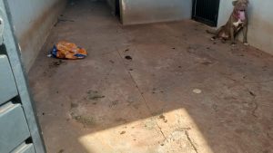 Uma equipe realizou fiscalização na residência no bairro Jardim das Nações ontem (2) à tarde e confirmou a denúncia. A casa estava fechada e, segundo os vizinhos, o proprietário estaria viajando há mais de uma semana. Pela fresta do protão, os Policiais verificaram que o animal de pequeno porte apresentava ferimentos e se podia perceber também falta de alimento e água, onde estavam os animais, bem como muitas fezes por todos os lados. Os vizinhos afirmaram que até jogavam ração, mas o pitbull agredia a cadelinha de pequeno porte e não a deixava comer.