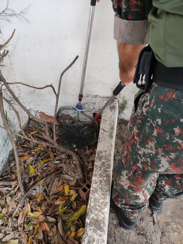 Os Policiais estiveram no local e com uso de um puçá e uma luva especial capturaram o gambá. O animal foi encaminhado a um médico veterinário, que avaliou estar bem de saúde e sem ferimentos e, então, os Policiais realizaram a soltura do bicho em seu habitat, em uma área de vegetação distante do centro urbano.