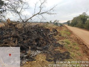 Em outra área da fazenda, os Policiais constataram o incêndio de galhadas e tocos em 12 frações de leiras. Apesar de que a derrubada da vegetação fora realizada com a licença ambiental, a queimada da vegetação nas leiras foi realizada ilegalmente, pois está proibida qualquer tipo de queima controlada no Estado. Os trabalhos eram realizados para o plantio de lavoura.