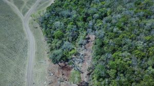 Imagem de drone da área atingida e da estrada construída.