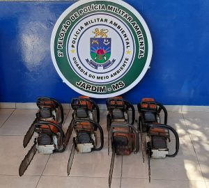Ainda na propriedade, os Policiais autuaram mais sete pessoas que realizavam trabalhos de exploração de madeira em leiras, de uma atividade de corte de árvores isoladas na fazenda. Para o corte das árvores havia autorização do órgão ambiental, porém, oito motosserras pertencentes às pessoas que executavam os trabalhos, não possuíam a Licença de Porte e Uso (LPU), o que inclusive é crime. As motosserras foram apreendidas.