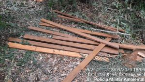 A equipe constatou o corte de quatro árvores de grande porte das espécies jatobá e piúva, uma com mais de dois metros de diâmetro, as quais estavam sendo desdobradas em tábuas no local.