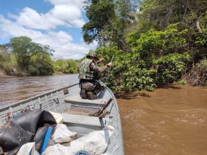 Na região próxima, ainda foram retirados do rio e apreendidos mais 27 anzóis de galho, quatro redes de pesca, que os Policiais calculam que os pescadores fugitivos tivessem armado. A fiscalização preventiva efetiva passa pela apreensão e retirada dos rios desses tipos de petrechos com alto poder de captura. A equipe calcula que os infratores tivessem acabado de montar o acampamento e, nessa quantidade de gente e com uso dos petrechos ilegais, poderiam dizimar cardumes.