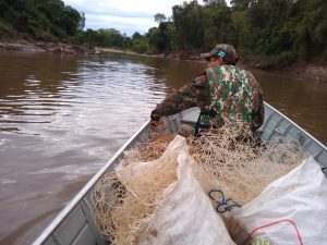 Campo Grande (MS) – Durante fiscalização ambiental no rio Miranda no município de Nioaque ontem e hoje (3) pela manhã, Policiais Militares Ambientais de Jardim localizaram um acampamento de pescadores, com uma cabana e encontraram diversos petrechos ilegais, bem como cabeças de peixes consumidas. Foram apreendidas cinco redes de pesca, três tarrafas, 12 anzóis de galho e seis molinetes com varas abandonados pelos pescadores.