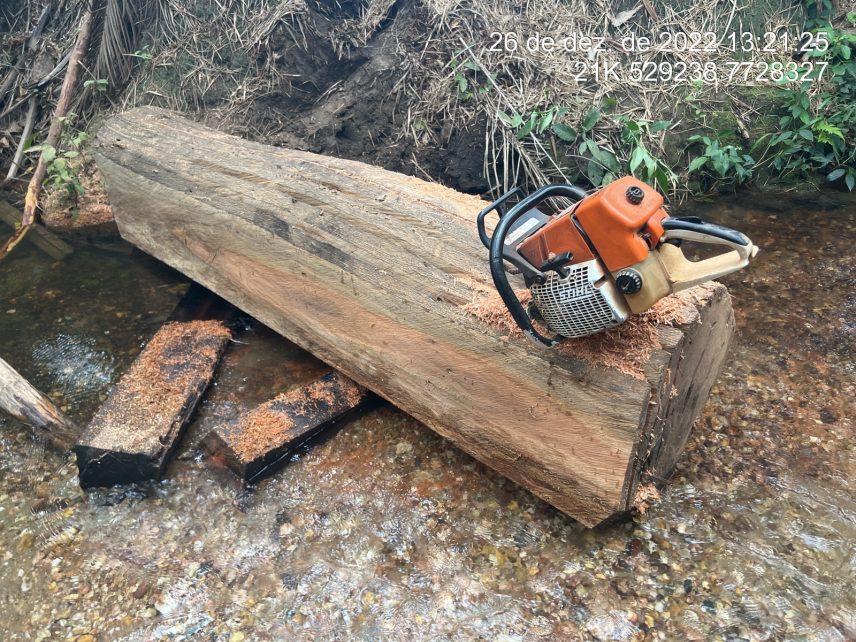 O infrator, com uso de uma motosserra realizava o corte de uma árvore à margem do córrego com a máquina, para a qual também não havia documentação ambiental (Licença de Porte e Uso -LPU). A madeira retirada da área protegida estava sendo beneficiada em tábuas, que foram apreendidas, juntamente com a motosserra ilegal utilizada no crime e algumas toras que eram exploradas. As atividades foram interditadas.