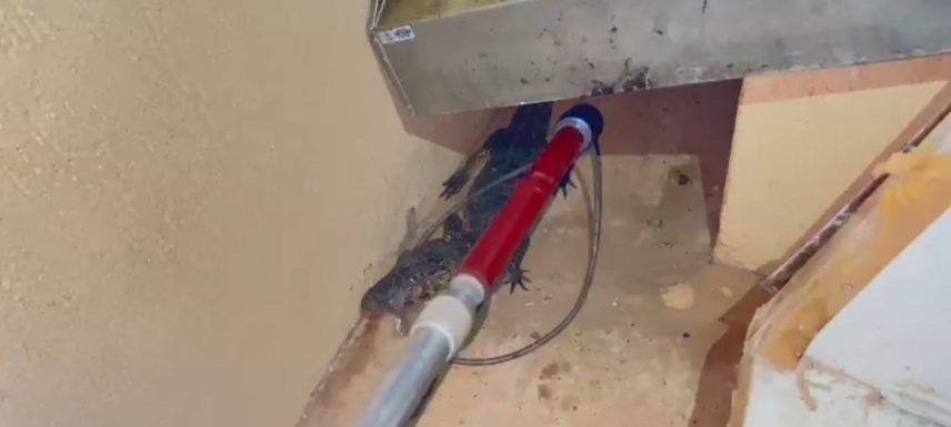 Polícia Militar Ambiental de Miranda captura jacaré em pátio de hospital no centro da cidade