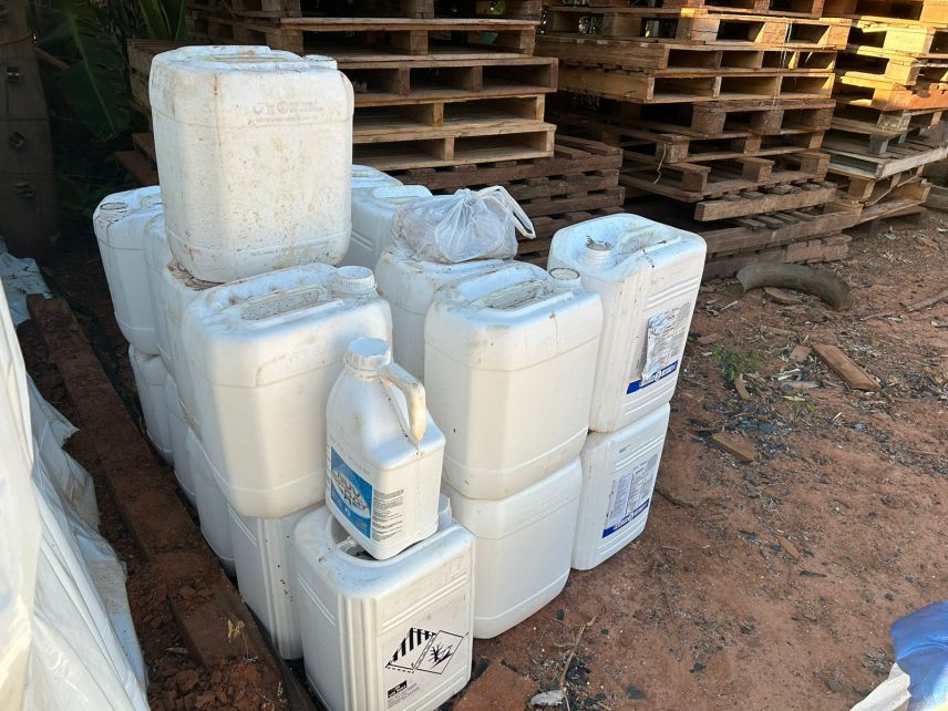 No primeiro local, foram encontradas na parte externa de galpões, 741 embalagens vazias, que estavam acondicionadas em sacas de grande porte (bags), sobre o solo expostas as intempéries climáticas, bem como, 269 galões cheios e 1.280 kg de agrotóxicos de várias marcas, com riscos de contaminação ambiental. O material foi apreendido. O proprietário rural (43), residente em Eldorado, foi autuado administrativamente e foi multado em R$ 11.092,00.