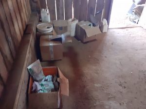 Agrotóxicos e embalagens espalhadas e produtos pelo chão.