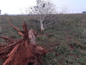 O infrator (79) derrubou em sua propriedade, 59 árvores de grande porte pela raiz com uso de máquinas, para mudança no uso do solo, de área de pastagem, para plantio de lavoura, sem autorização do órgão ambiental. A maioria das árvores era da espécie ipê.