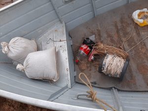 Durante a fiscalização, os Policiais e fiscais retiraram do rio cinco redes de pesca e duas cordas de espinhéis, medindo 100 metros com 20 anzóis cada um e 23 anzóis de galho.