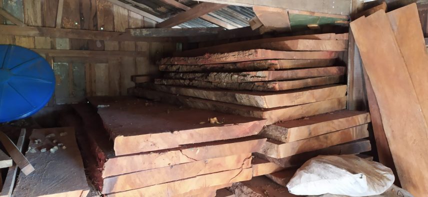 Pertencente ao infrator, foram encontrados e apreendidos no seu lote, 13,30 m³ de madeira nativa serrada de várias espécies, especialmente, das espécies faveiro (Peltophorum dubio) e peroba (Aspidosperma polyneuron) em formato de pranchas, vigas e mourões. O assentado afirmou que parte da madeira ilegal ele utiliza no seu imóvel e também vende. Afirmou também que comprou parte do material de vendedores do próprio assentamento, dos quais não sabe o nome, bem como parte retirou de dentro da reserva legal já serrada e que não possui documentação ambiental.