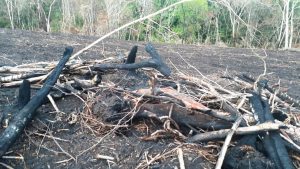 Material lenhoso queimado na leira.