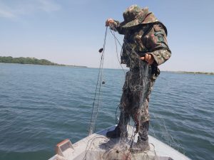 Campo Grande (MS) – Durante fiscalização no rio Pântano no município de Paranaíba, Policiais Militares Ambientais de Aparecida do Taboado e fiscais do Imasul, que trabalham na operação Big Fish II, prenderam hoje (8) três pescadores por pesca predatória. Os infratores pescavam embarcados e foram surpreendidos armando e conferindo quatro redes de redes de pesca (petrechos proibidos), que haviam armado, as quais medidas perfizeram 150 metros.
