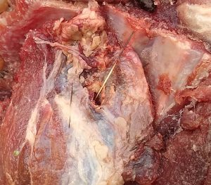 Marca de tiro na carne apreendida.
