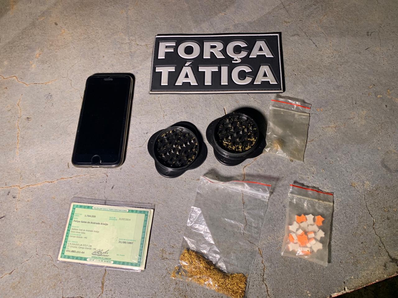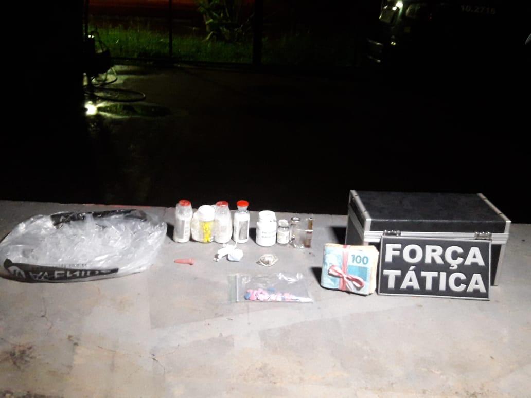 Um casal foi flagrado por uma equipe de força tática, no estacionamento de uma lanchonete no centro da Capital, tendo em sua posse 22 comprimidos de ecstasy. Durante diligências, policiais apreenderam na residência do casal, R$3.200,00 reais em dinheiro, maconha, cocaína e ainda anabolizantes.