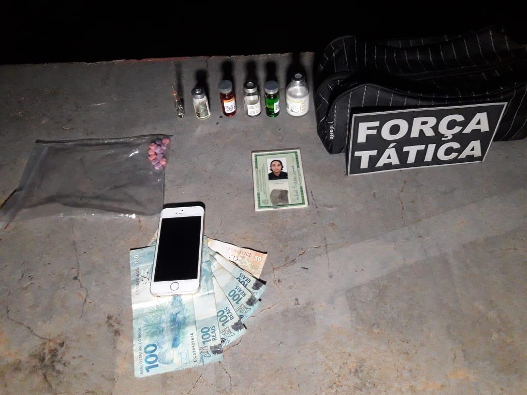 Já com o homem de 31 anos, policiais apreenderam anabolizantes e ecstasy, além de R$ 600,00 em dinheiro. O autor confessou a equipe que realizava a venda dos materiais ilícitos apreendidos em sua posse, discriminando inclusive que os supostos compradores entravam em contato com ele através do telefone celular para adquirir as substâncias, e que por cada comprido de ecstasy cobrava a quantia de R$ 60,00.