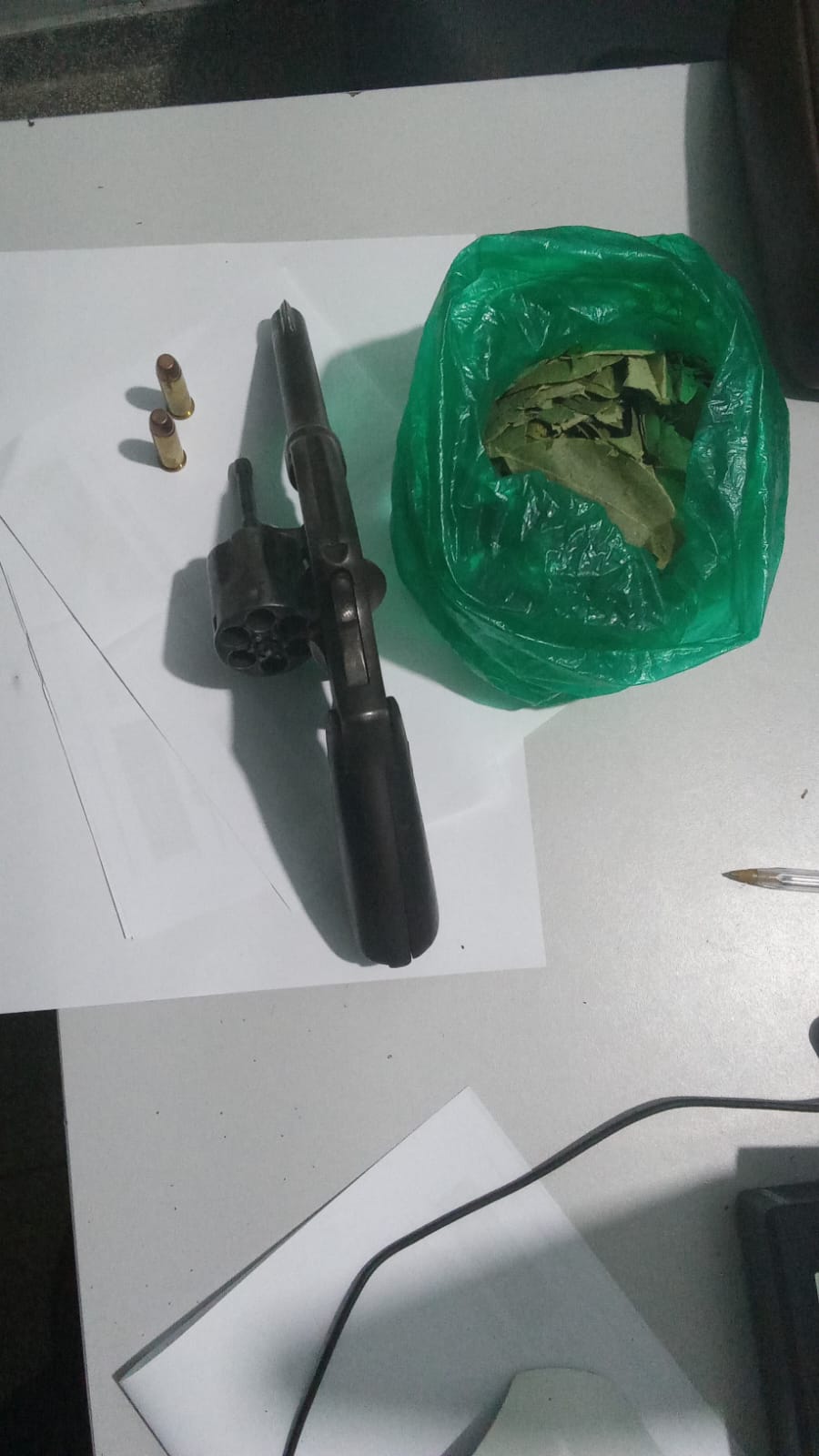 Durante a busca pessoal e na bolsa, os policiais localizaram um revólver calibre .38 com duas munições intactas, dois aparelhos celulares (um da marca Polo e outro Samsung de cor verde), R$ 45,75 em dinheiro, além de moedas estrangeiras (8 bolivianos). O autor também portava uma pequena quantidade de folha de coca.