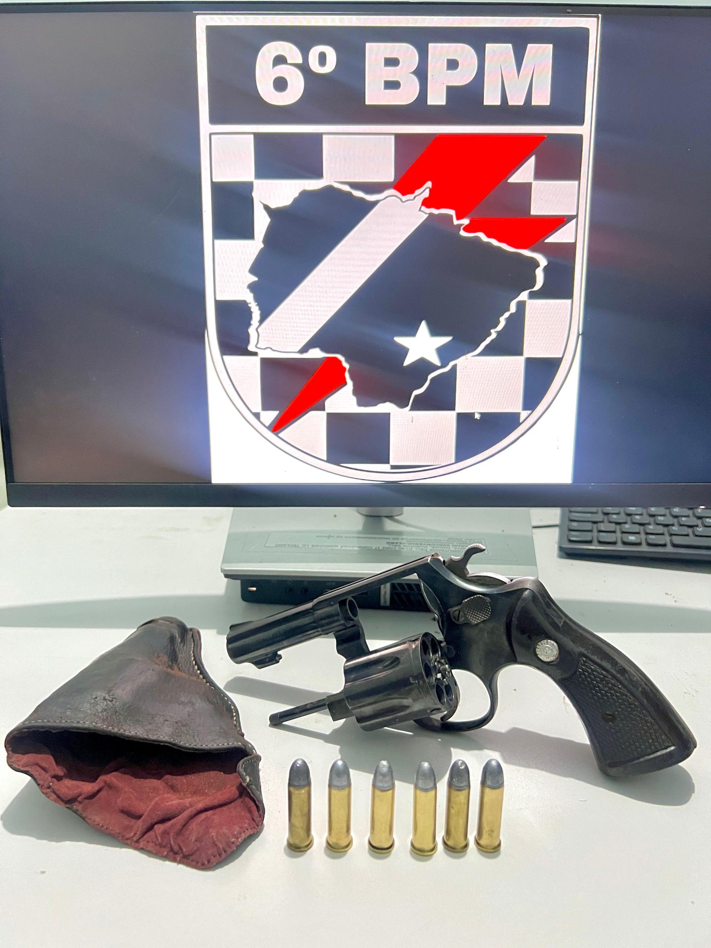 Na busca pessoal nada de ilícito foi encontrado, porém, ao vistoriarem o veículo, os policiais localizaram em local visível no assoalho do lado do motorista um revólver calibre .38 Special, municiado com seis munições intactas, além de um coldre.