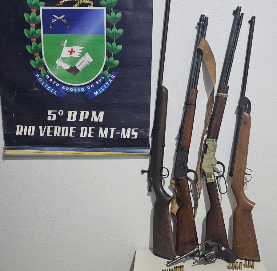 Na fazenda, os militares localizaram e apreenderam um arsenal composto por quatro armas longas — calibres .38, .22 e outra de calibre não identificado —, além de um revólver e munições.
