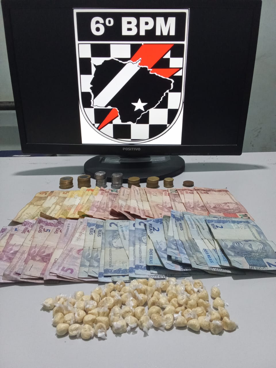 Durante a abordagem, os policiais encontraram uma pochete contendo 81 trouxinhas de substância análoga à pasta base de cocaína, totalizando cerca de 40 gramas, além da quantia de R$ 585,45 em dinheiro trocado e um aparelho celular.