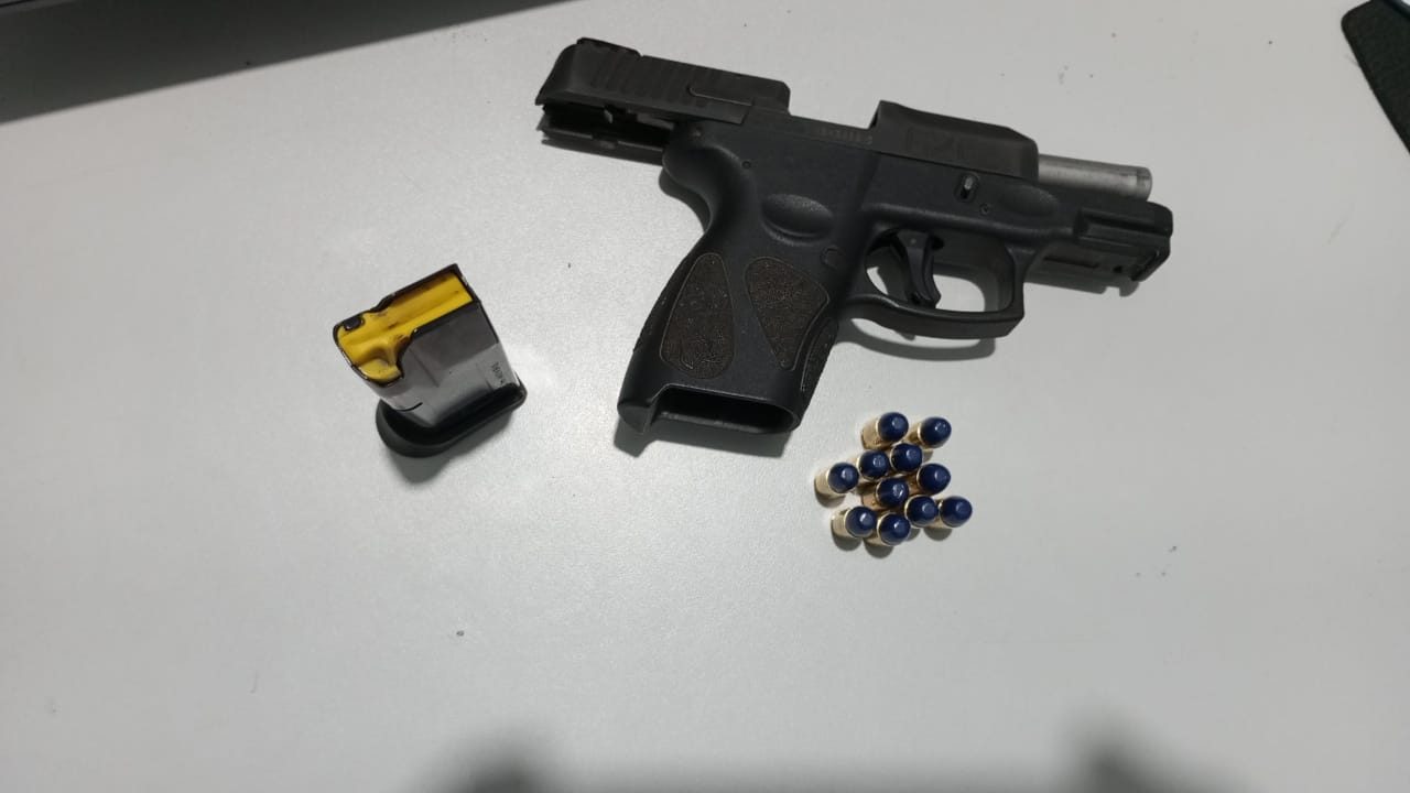 Durante a revista no interior do automóvel, realizada pelo Sargento, foi localizada uma pistola calibre 9mm sob o banco do motorista. Ao ser questionado sobre a posse da arma, um dos ocupantes assumiu a propriedade do armamento.