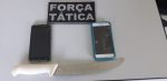 Diante dessas informações da vítima, a equipe de Força Tática saiu em rondas, para tentar encontrar os indivíduos e evitar que fizessem outras vítimas. Localizaram os indivíduos na Rua Manoel Ferreira, ao serem abordados, um dos menores estava com uma faca de açougueiro de aproximadamente 30 cm e no seu bolso foi localizado um celular de cor preto, que haviam acabado de roubar de uma senhora na Rua Barão de Mauá em frente ao CEINF, informação que foi passada pelo CIOPS enquanto os indivíduos estavam sendo abordados.