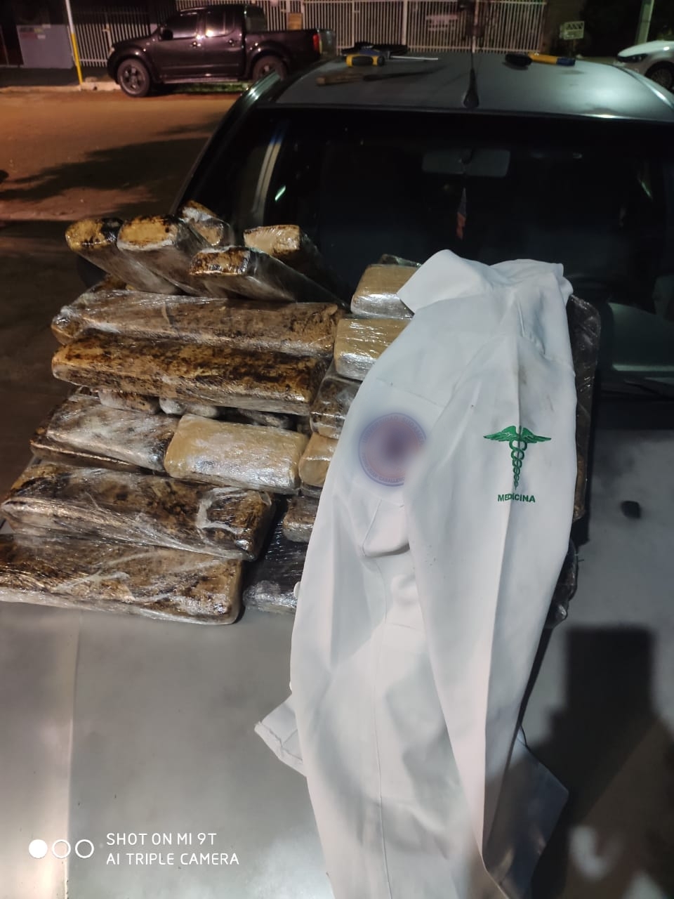Os policiais realizavam rondas pela área central, quando ao passarem pela Av. Dias Barroso, avistaram um veículo modelo Fiat Pálio com placas de Fernandópolis/SP. A guarnição acompanhou o veículo a distância e realizou a abordagem na rua Formosa, próximo ao Cemitério. Foi solicitado ao condutor, um homem de 35 anos, a documentação pessoal e do veículo, porém, nenhuma irregularidade foi encontrada. Uma mulher de 45 anos estava como passageira no carro. Os policiais perceberam que os dois apresentavam nervosismo anormal e ao serem indagados sobre o trajeto que faziam, a mulher disse aos Agentes que é Estudante do sexto ano de medicina, cursando no Paraguai, e que estaria na região para atender uma paciente.