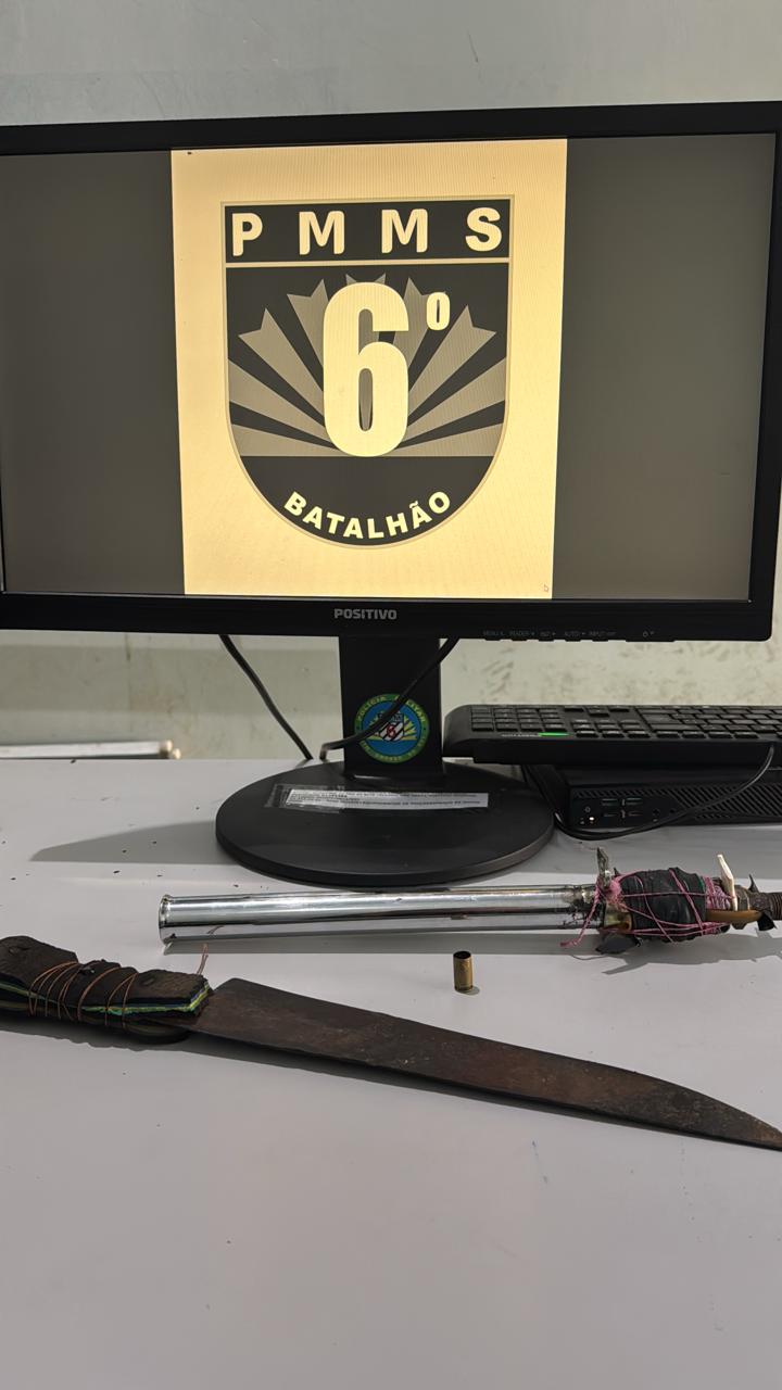 Diante da confirmação do relato da vítima, os policiais realizaram busca no interior da residência, onde localizaram, em um dos cômodos, uma arma artesanal do tipo “bate-bate”, escondida sob roupas, além de uma cápsula de munição deflagrada, encontrada nas proximidades do artefato.