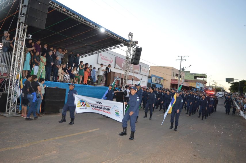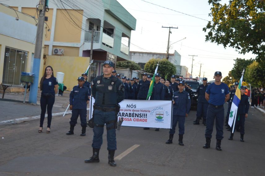 Com a presença do Comandante do 5º Batalhão de Polícia Militar, Tenente-coronel James Magno Morais Silveira, do Comandante do 2º Pelotão PM de Sonora, Capitão Rodrigo Lima Yoshimura e diversas autoridades, a solenidade começou logo pela tarde com o desfile das Escolas, instituições, Projetos Sociais e demais instituições de forma a comemorar o aniversário a emancipação política do município.