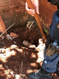 Diante da atitude suspeita, foi realizada uma varredura em todas as repartições do imóvel, sendo possível verificar que no quintal havia um pequeno espaço de terra revirado, sendo então localizado pelos policiais um envólucro de substância análoga ao crack, que após pesagem, aferiu-se mais de 1kg do entorpecente.