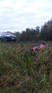 Bodoquena(MS) Nessa quarta-feira (17), policiais militares do 3º Pelotão/ 1ª Companhia Independente de Policia Militar de Bodoquena, receberam uma informação de um acidente de trânsito, uma queda de moto na Rodovia MS 178 sentido Bodoquena à Bonito, onde havia duas pessoas caídas no chão ao lado da pista com uma motocicleta de cor vermelha com avarias próximo deles.