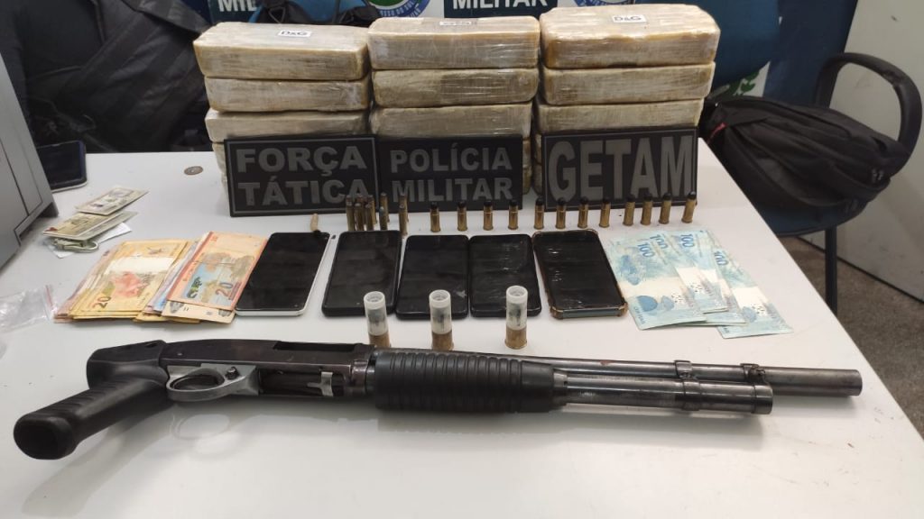 Enquanto as guarnições policiais realizavam a apreensão dos ilícitos. A terceira pessoa mencionada foi abordada em um veículo em frente à residência. Foi feita a revista, mas nada de ilícito foi encontrado com o homem de 24 anos. Porém o mesmo confessou que iria buscar a droga mencionada. No momento da ação um dos autores avistaram o veículo que seria do proprietário de todo material ilícito. A equipe da Força Tática realizou a abordagem nos 3 (três) indivíduos que estavam no interior do veículo. Em posse dos indivíduos estavam com uma quantia em dinheiro brasileiro e boliviano. Na delegacia um dos autores informou que na mesma residência que as drogas foram encontradas, havia uma arma de fogo escondida em um dos cômodos, a equipe do GETAM então retornou na residência e encontrou escondido no forro da mesma uma Arma de fogo de uso restrito calibre .12 mm.