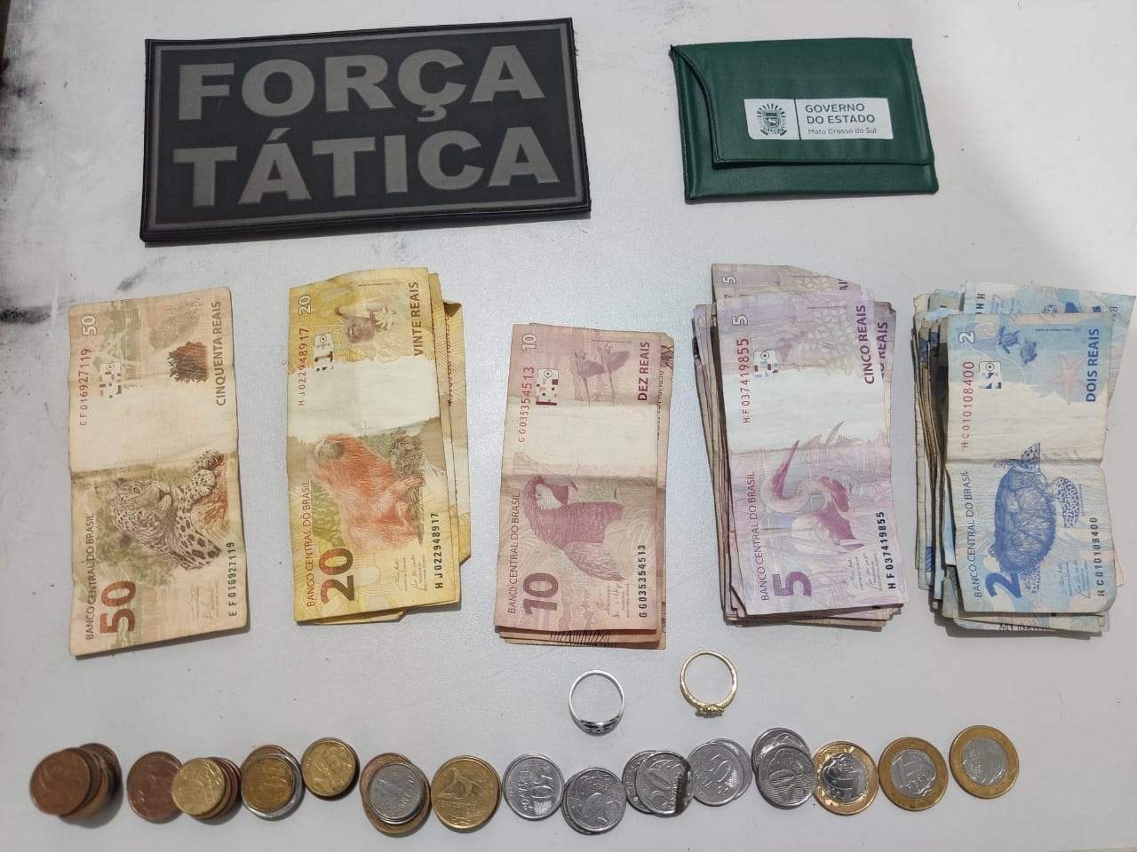 Com isso, após populares relatarem que os indivíduos que abandonaram o veículo estavam próximos, esta equipe realizou diligências no intuito de localizá-los, onde na altura da Rua Paraná com a Rua José Fragelli, foi possível visualizar que dois indivíduos ao avistarem a viatura da equipe policial começaram a correr, aparentando tentar fugir da equipe. Por isso, diante da fundada suspeita, esta equipe realizou acompanhamento aos mesmos, sendo que em determinado momento, após alcançá-los, estes passaram a investir contra a equipe, sendo necessário então o uso de força para imobilizá-los. Nesse instante, foi feita busca pessoal aos indivíduos, sendo constatado que um deles (23), tinha em sua posse um celular com a tela quebrada e uma grande quantidade em dinheiro trocado, além de dois anéis aparentemente femininos. Com o outro indivíduo (22) nada foi encontrado em sua posse.