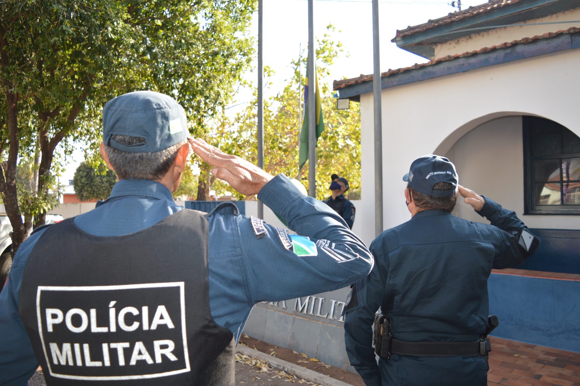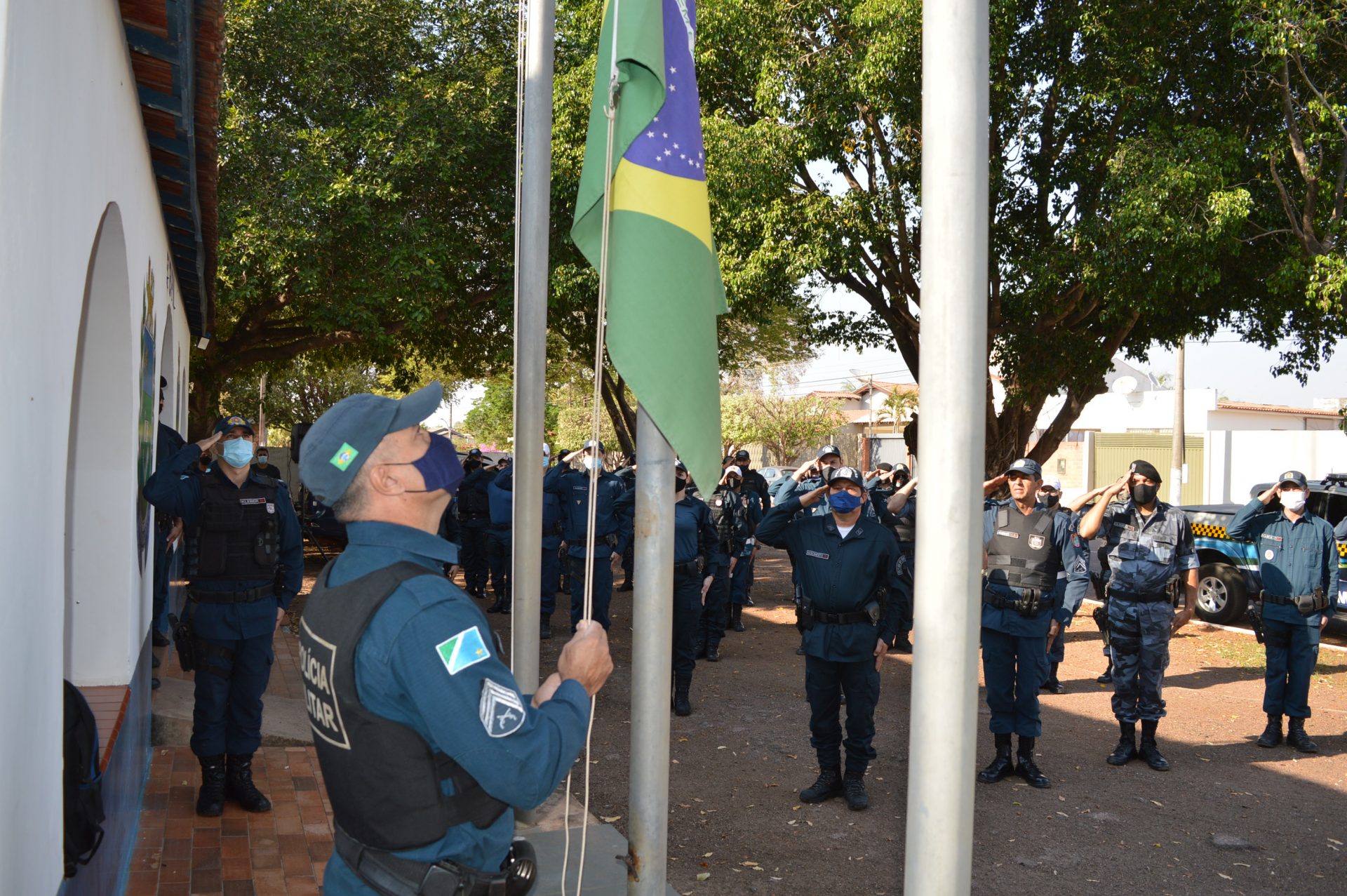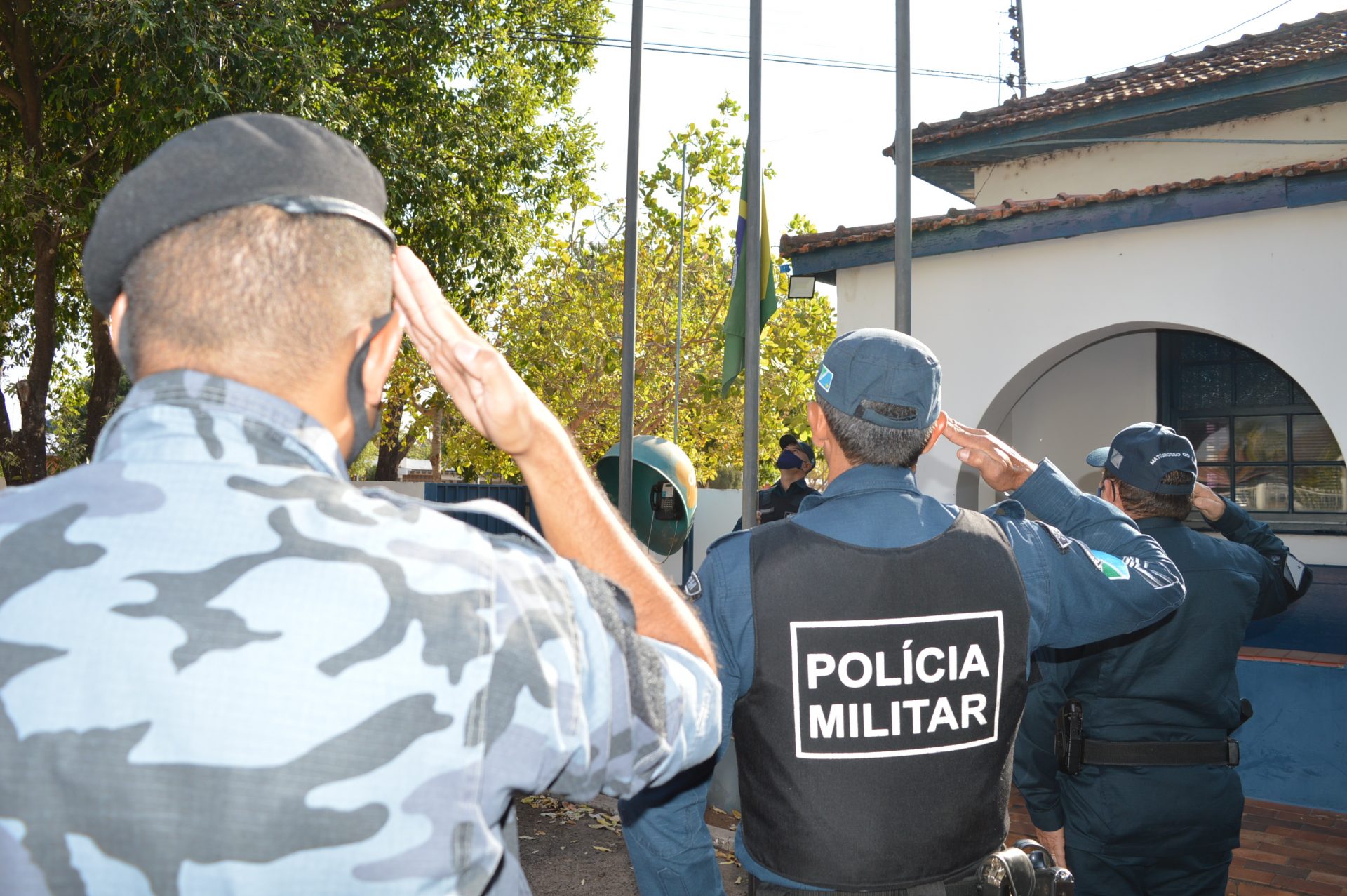 Foi realizado uma formatura com o hasteamento da bandeira nacional, leitura de elogio e entrega de uma placa de agradecimento pelos bons serviços prestados ao 5º Batalhão de Polícia Militar.