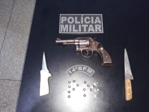A guarnição Policial foi acionada por uma mulher a qual informou que seu pai havia bebido e estava muito alterado. Ao chegar no local encontramos o autor sentado na frente da residência e após revista minuciosa foi encontrado na cintura do mesmo duas facas e próximo de onde o mesmo estava um revólver calibre 38 da marca Taurus, com 06 (seis) munições intactas e uma sacola de supermercado com mais 10 (dez) munições calibre 38 também intactas. Diante aos fatos o autor recebeu voz de prisão, e foi encaminhado para Delegacia de Policia Civil para Providencias.