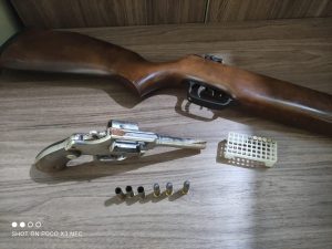 No local dos fatos foram encontrados, uma mulher de 35 anos e seu filho de 18 anos, com ferimentos na cabeça que segundo as vítimas, foram oriundos de uma coronhada. Os envolvidos relataram que o autor da agressão foi um homem de 43 anos que é amasio da vítima. No local também foi encontrado 01 revolver, calibre 38, marca: taurus, com 03 munições intactas e 03 munições deflagradas, todas da marca águila e 01 rifle de ar comprimido, calibre 5.5, sem marca aparente e 06 (seis) munições, calibre .22, marca SUPER. As vítimas foram encaminhadas para o Hospital e Maternidade Local para atendimento. Durante a confecção do Boletim de ocorrência. o autor apresentou-se na Delegacia por livre e espontânea vontade para prestar esclarecimentos.