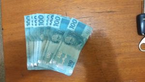 A guarnição foi solicitada para atender uma ocorrência no comércio local, em contato com o solicitante de 27 anos relatou que o autor havia passado uma nota de R$100,00 reais e ao perceber que era falsa, o indivíduo já havia se deslocado do local. Durante as diligências o autor fora localizado e após a revista pessoal encontraram no bolso de sua bermuda o valor de R$400,00 (quatrocentos reais), sendo que 04 notas de 100 reais estavam com o mesmo número de serie. Ao ser questionado sobre as notas falsas, o autor relatou que havia encontrado uma quantia de 1.000,00 (mil reais) e que já havia repassado o valor de R$600,00 (seiscentos reais) no comércio local e também havia repassado um valor pra outra pessoa.