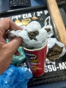Os policiais militares deslocaram até o endereço, e ao perceber a presença policial o proprietário correu, sendo alcançado  em uma rua paralela. Ele foi levado até a sua residência para acompanhar as buscas. Foi encontrado no colchão da casa do autor 2 (dois) tabletes de maconha e 1 (uma) porção de crack.  E no momento em que a equipe policial fazia buscas na residência, receberam uma ligação anônima no telefone funcional na qual relatavam que o autor possuía uma arma de fogo e que ele usava ela para ameaçar as pessoas, e que a mesma se encontrava escondida na residência de um amigo.