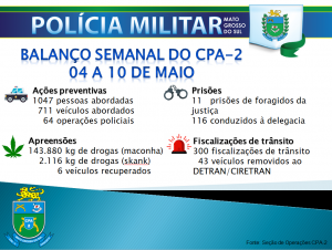 Três Lagoas (MS) – Polícia Militar divulga o balanço das ações realizadas de 04 a 10 de maio de 2020 na área do Comando de Policiamento de Área -2 (CPA-2) composta pelas unidades: 2°BPM, 5°BPM, 13°BPM, 4ªCIPM, 7ªCIPM e 12ªCIPM.