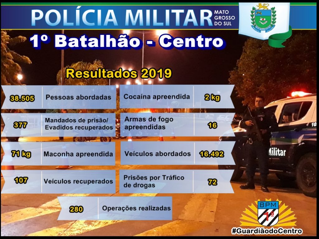 Campo Grande (MS) – Responsável por atuar no policiamento preventivo e na manutenção da ordem na região central de Campo Grande – MS, principal centro comercial do estado de Mato Grosso do Sul, 1º Batalhão de Polícia Militar divulgou hoje (07/01) resultados das ações desenvolvidas pela unidade no período de Janeiro a Dezembro de 2019, que culminaram nos dados a seguir: